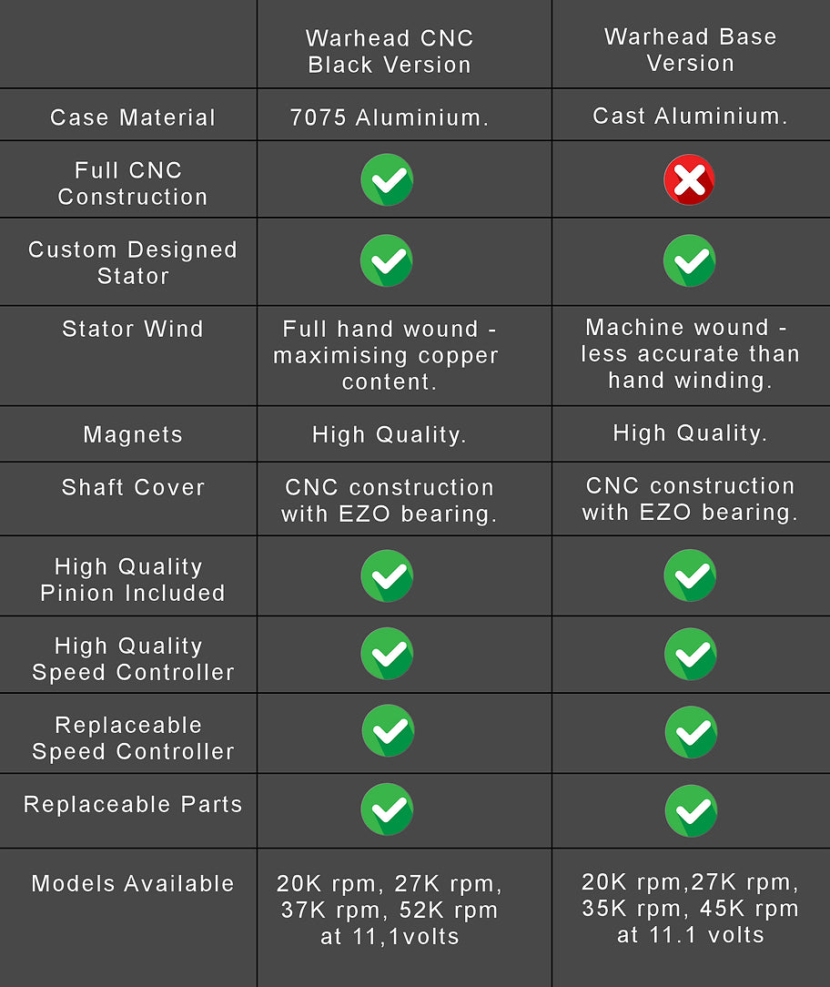 Warhead Industries harjattomat moottorit nostavat sähköaseen täysin uudelle tasolle! Harjattomissa tasavirtamoottoreissa ei ole kuluvia harjoja (hiilet), ne edustavat valtavaa teknologista kehitystä sähkömoottoritekniikassa. Harjattomat moottorit tuottavat vääntöä huomattavasti korkeammalla hyötysuhteella perinteisiin harjallisiin tasavirtamoottoreihin verrattuna ja ne tarjoavat uskomattoman suorituskyvyn.
